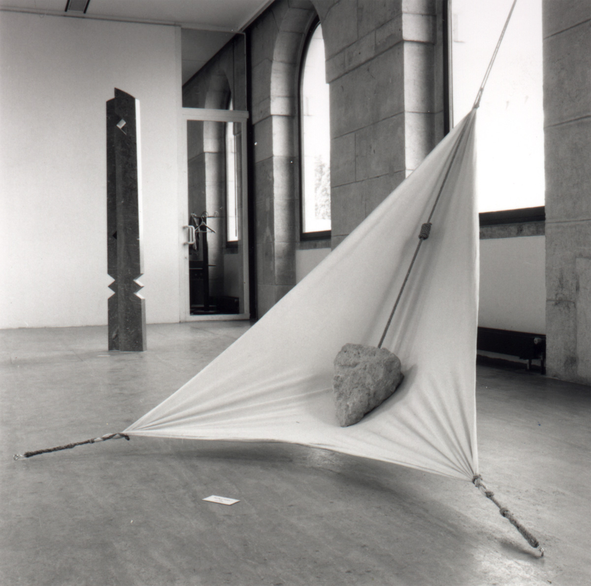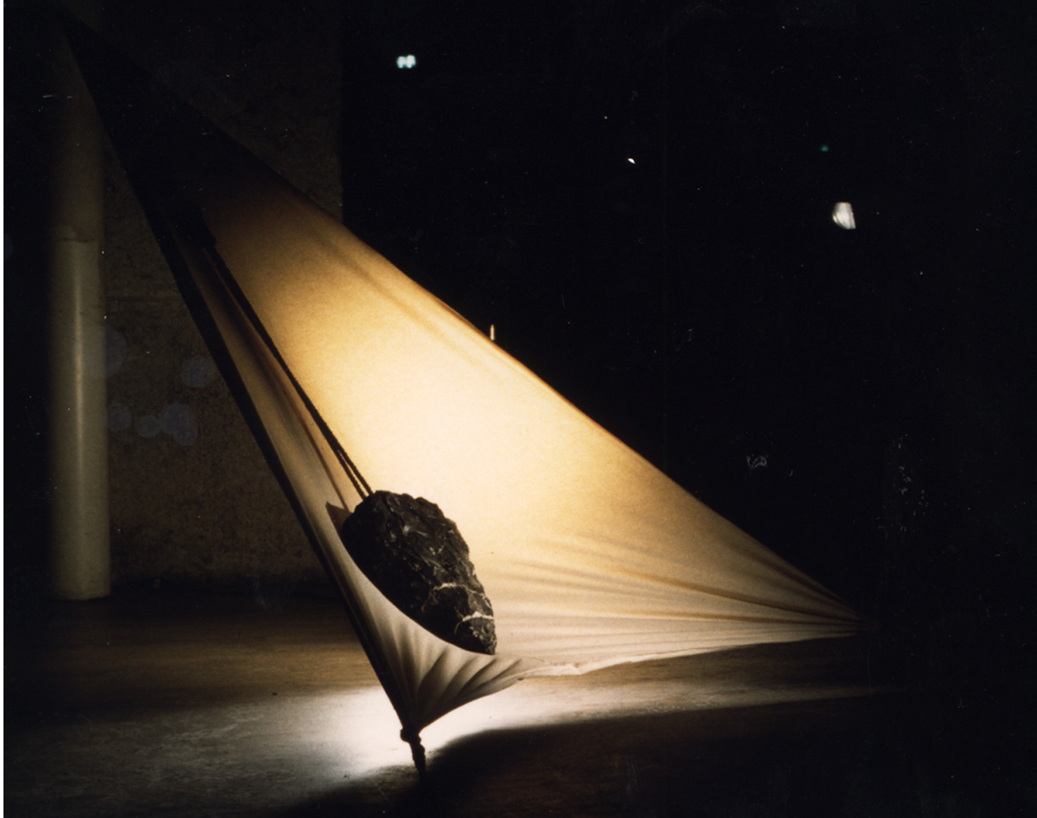 Série d’installations qui s’inspirent du concept du « qi » japonais (souffle de vie), et qui met en couple un pendule taillé en silex et une voile. Le filin est remplacé ici par une corde de chanvre tressé, et fait le lien entre les deux objets. Tantôt la corde semble se défaire et s’ouvrir comme une voile, tantôt sa tresse serrée porte la pierre, marquant le passage entre le vide et le plein. Le poids de la pierre tend la voile, qui a son tour peut tenir la pierre sur la pointe. Les deux éléments ainsi reliés trouvent toujours un équilibre dont l’harmonie est la clef. Voile et silex installent un système en parfaite interdépendance. Légèreté et tension, pesanteur et apesanteur, figent ainsi dans l’espace une position normalement instable.