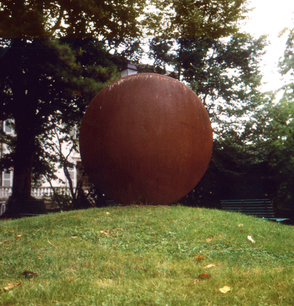 Ici, c’est le métal qui a porté son travail. Son Fruit Urbain (dont il existe un version plus petite dans le parc de la Mairie du Grand-Lancy) est un assemblage de deux fonds de cuve en tôle qui semblent surgir de la terre. Ces disques métalliques rouillés, dont le destin était de finir à la décharge, prennent une signification nouvelles : objets « récupérés », ils donnent naissance à un « fruit » extraordinaire, clin d’oeil à notre monde industriel qui ne sait que faire de ses déchets. L’artiste procède ainsi d’une démarche écologique très consciente, et nous invite à réfléchir à une vision régénérée de notre environnement où nos détritus pourraient trouver un nouveau destin…